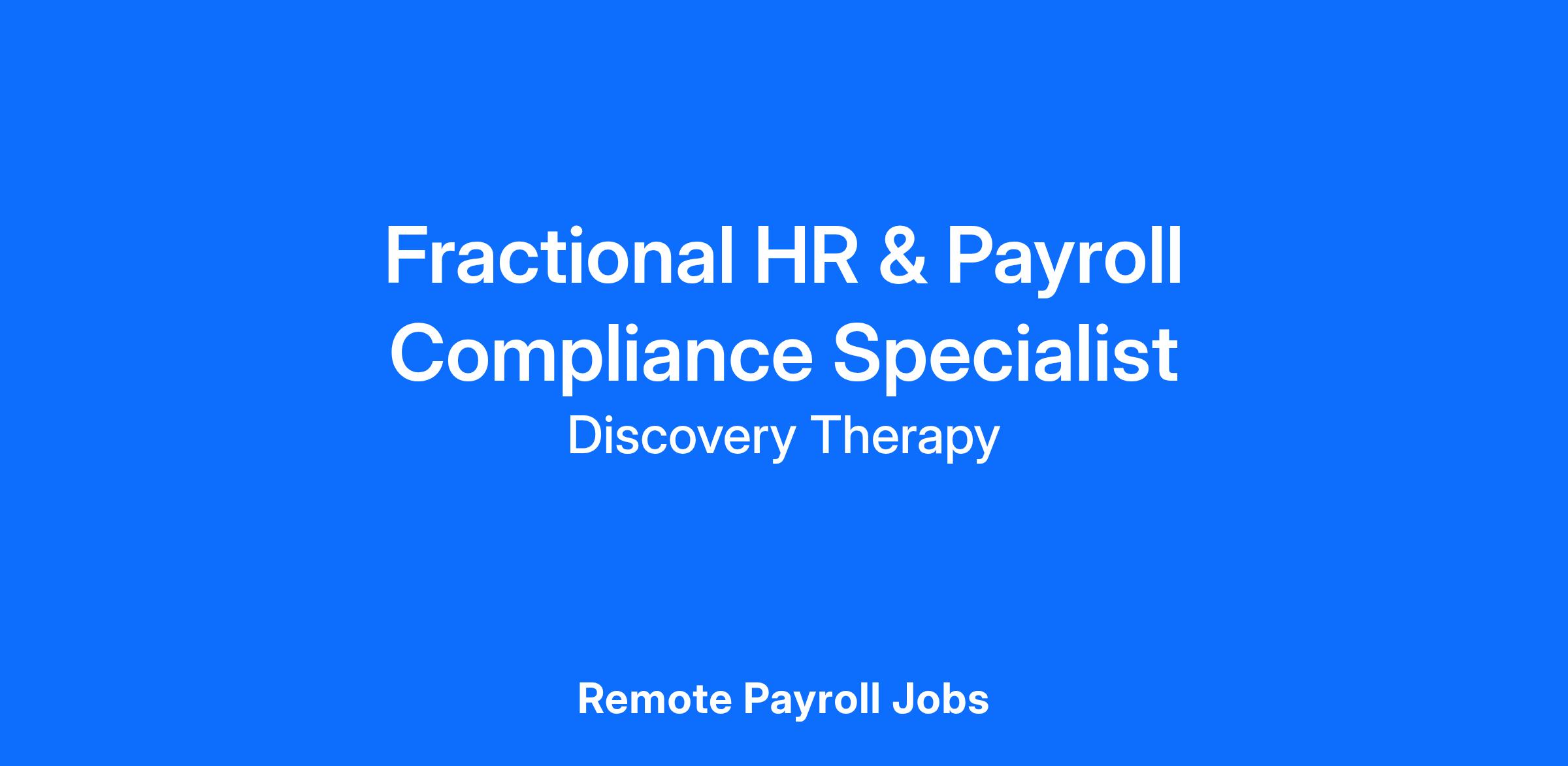 Fractional HR & Payroll Compliance Specialist (REMOTE)Part-Time | 1–3 hours/week | $13–$15/hour | 1099 ContractorDiscovery Therapy is seeking a