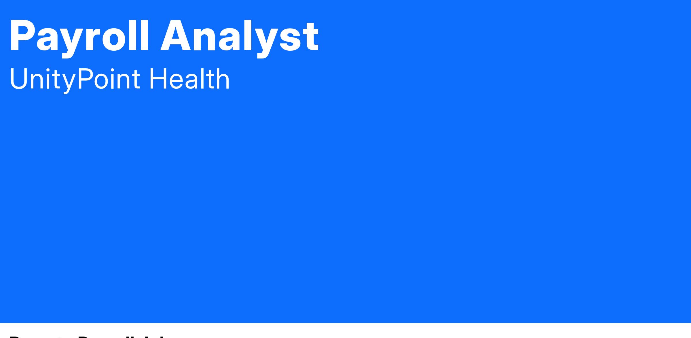 The Payroll Analyst contributes professional knowledge of payroll processes and requirements in order to maintain and analyze payroll information to ensure accurate processing of payroll checks and taxes. Assists in balancing and calculation of W-2 forms and tax reports. Works closely with the AskHR teams to give the employees a good experience.